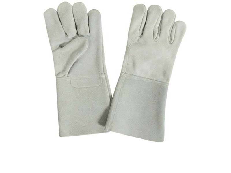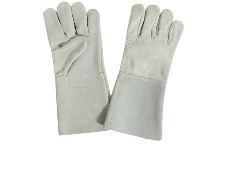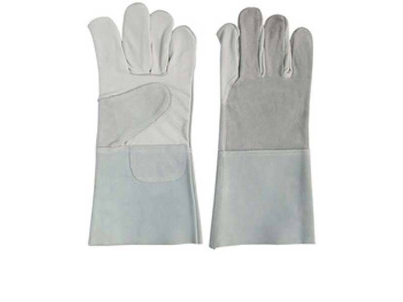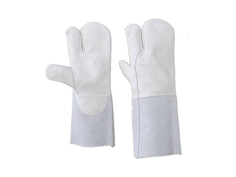 Art.S-019 : 3 finger welder gloves in natural colour cow grain leather at palm, back and cuff in split leather. Length-35cm